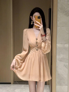 轻奢甜美V领重工钉珠长袖气质长裙女秋季新款高腰显瘦连衣裙N8091