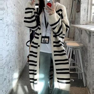 韩系条纹中长款毛衣开衫外套女2025秋冬季慵懒风小众别致针织上衣