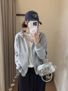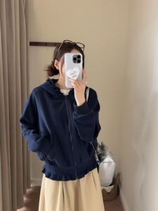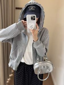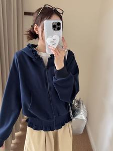 韩代减龄温柔木耳边连帽外套女秋季新款宽松百搭短款拉链上衣开衫