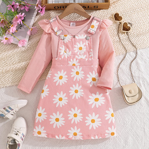 女童套装外贸童装2025欧美夏季新款坑条长袖上衣印花背带裙两件套