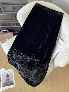 批发早秋款复古气质丝绒烧花丝绒半身裙松紧腰中长裙半身裙高级感