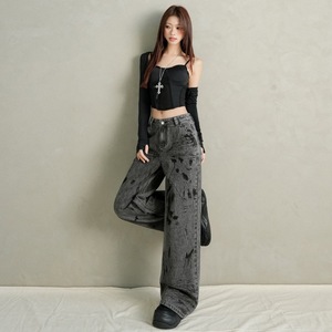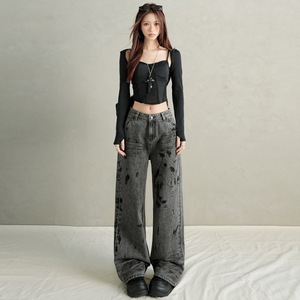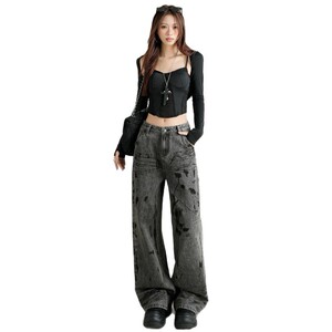 复古扎染牛仔裤子女秋季新款美式港风高腰宽松显瘦直筒垂感拖地裤