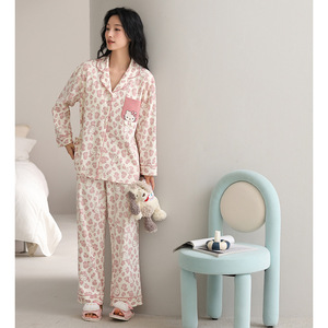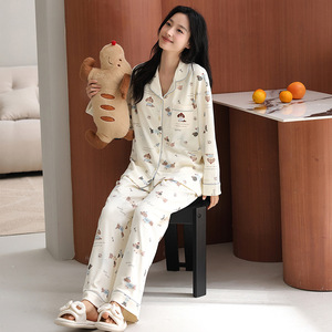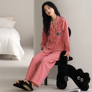 睡衣女士2025秋冬带胸垫开衫长袖长裤格子印花套装休闲可爱家居服
