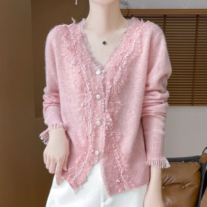秋冬新款V领打底衫流苏蕾丝长袖开衫女宽松复古针织外套洋气上衣