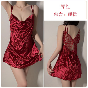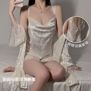 瑰若甜美蝴蝶露背睡衣纯欲惹火深V荡领丝绒睡裙外袍家居套装4887