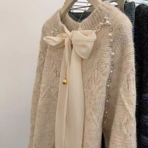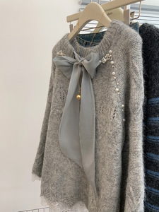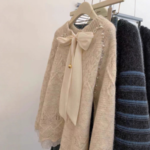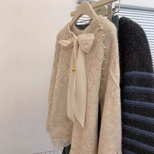 蝴蝶结钉珠宽松套头毛衣女加厚中长款遮屁股洋气上衣慵懒风高级感