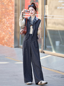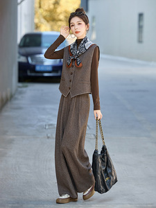 套装女2025秋季新款时尚减龄马甲打底衫阔腿裤三件套配丝巾HE5103