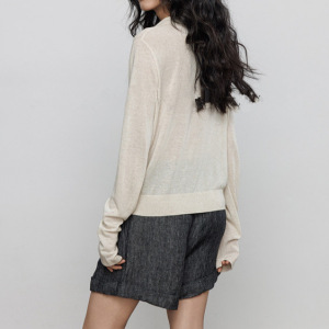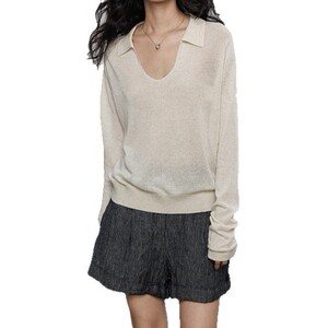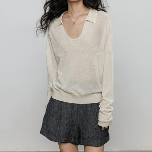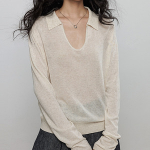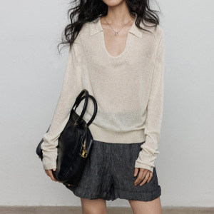 亚麻长袖防晒针织衫T恤女2025早秋新款翻领老钱风打底休闲上衣潮