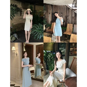 赫本风气质简约收腰褶皱连衣裙女春秋韩系小个子法式斜肩沙滩长裙