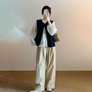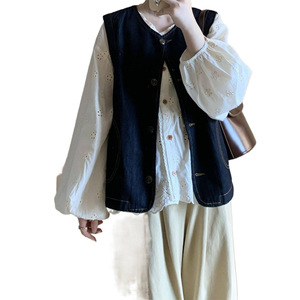 韩系复古早秋穿搭一整套牛仔马甲背心女+绣花衬衫+垂直宽松感裤子