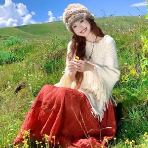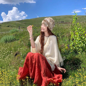 新疆云南草原穿搭波西米亚风复古红色吊带连衣裙子白色针织披肩女