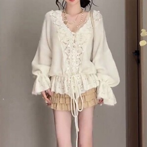 2025秋装新款法式镂空钩花女装针织毛衣V领宽松抽绳慵懒上衣外套