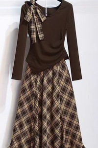J5Y不规则斜肩长袖系带上衣格纹半身裙女套装薄款2025早秋新款连