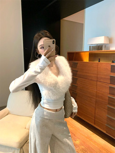 2025秋冬新款复古气质设计感毛领上衣辣妹修身显瘦交叉V领长袖T恤