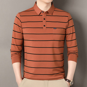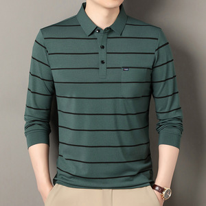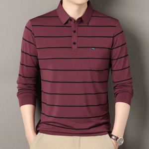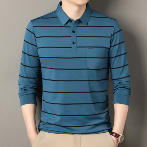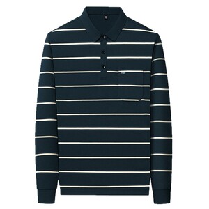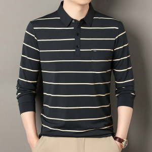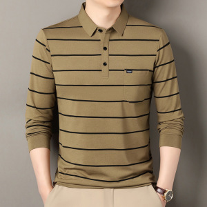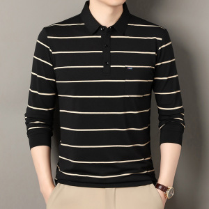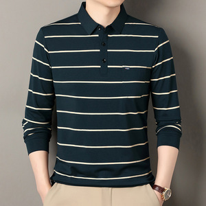 棉65%色织条纹polo衫长袖中年男士秋冬新款宽松潮流时尚休闲t恤