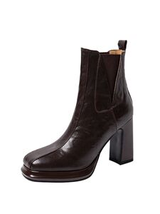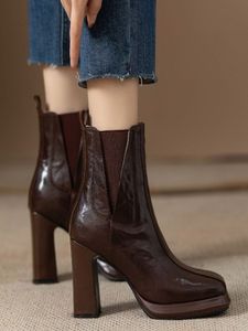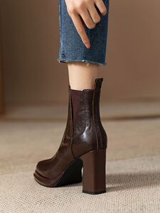 巨舒服短筒时装靴2025防水台时尚粗跟高跟靴子松紧带增高短靴棕色