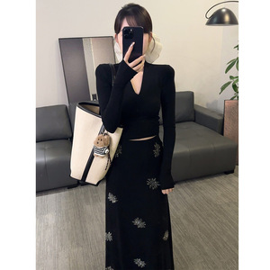 早秋女法式纯欲风套装修身气质上衣烫钻半身裙2025超火穿搭一整套