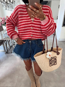 亚马逊2025新款撞色条纹针织开衫V领时尚街头风休闲宽松女式毛衣