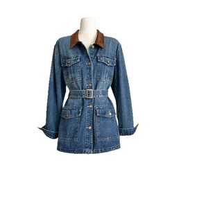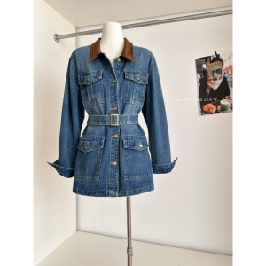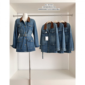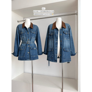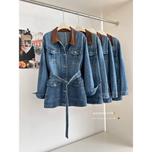 秋上新!韩系拼色领牛仔外套女时尚设计感气质百搭中长款夹克上衣