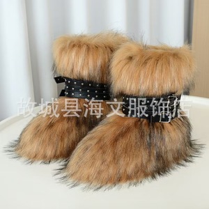 新款炸街辣妹厚底雪地靴Y2K朋克仿毛靴子铆钉靴显瘦暗黑系绑带靴