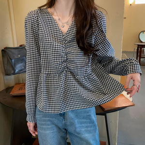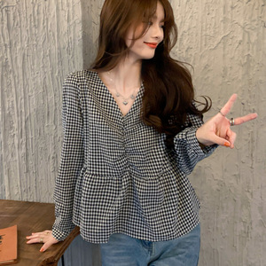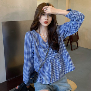 秋季大码女装泡泡袖V领格子上衣打底胖mm小众设计感短款衬衫200斤