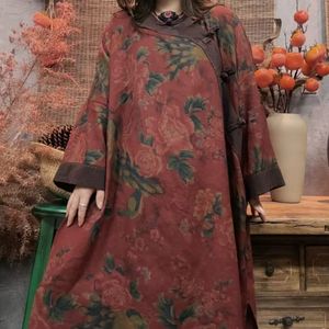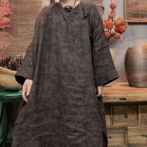 2025秋季新款 复古立领盘扣长袖印花亚麻中长款宽松版衬衫长袍