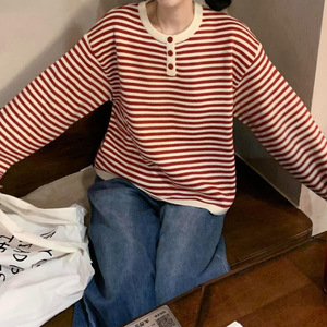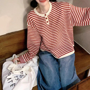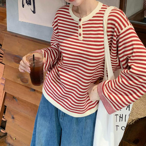 撞色条纹红色毛衣女秋冬季宽松韩系慵懒风感针织圆领穿搭上衣