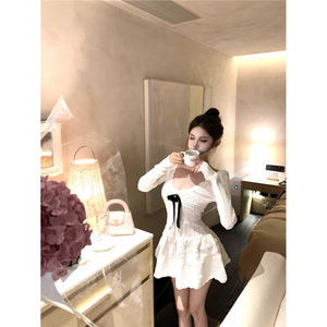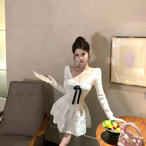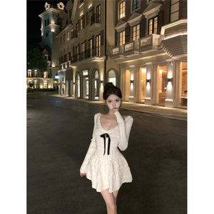 糖糖~千金白色生日裙短裙长袖针织连衣裙女