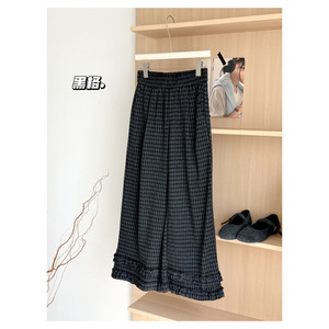 2025秋冬新款木耳边撞色格纹阔腿裤女韩系松紧腰宽松显瘦休闲裤