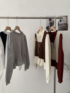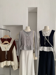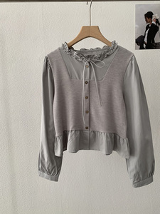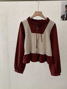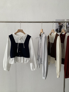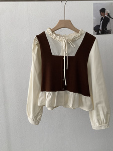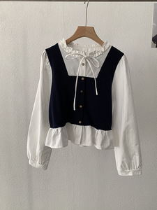 欧玛莱 假两件针织马甲拼接衬衫早秋新品木耳边长袖显瘦上衣4725