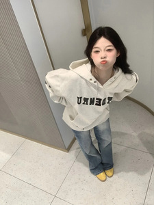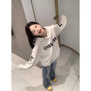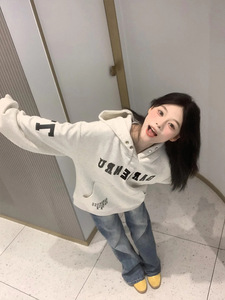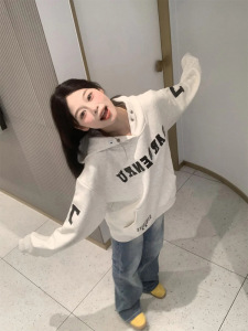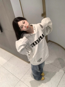 美式复古灰色刺绣连帽卫衣女春秋oversize潮牌宽松小众设计感外套