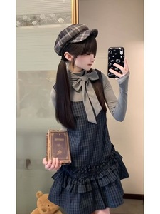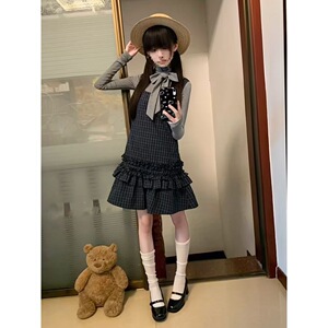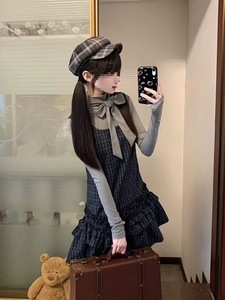 少女心事 秋装新款日系古早vintage设计蝴蝶结上衣格纹连衣裙套装