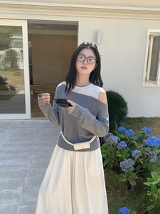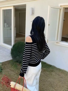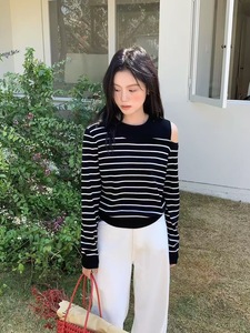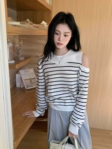 秋季新款韩系设计感斜露肩毛衣女圆领套头条纹韩版打底针织衫上衣