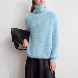 仿水貂绒高领针织衫女2025秋冬半开襟拉链毛衣落肩袖上衣跨境专供