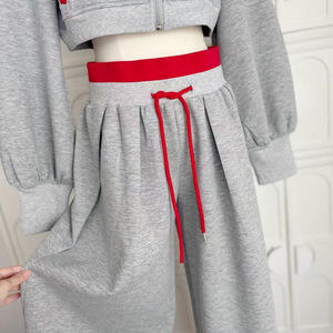 灰红拼色大兜帽短款卫衣打褶直筒宽松抽绳卫裤两件套套装