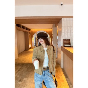实拍2025秋季新款仿麂皮绒铆钉休闲复古重工垫肩短款夹克机车服女