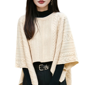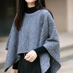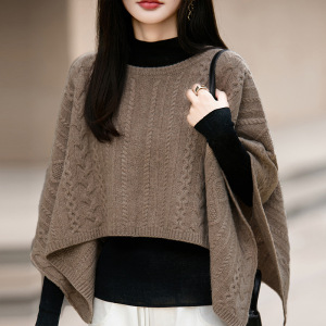 厂家跨境批发2025秋冬新款100%羊毛绞花圆领保暖针织加厚斗篷披肩