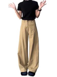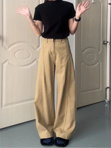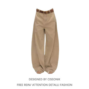 大码美式复古卡其色弯刀牛仔裤女秋季设计感胖mm宽松阔腿直筒长裤