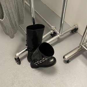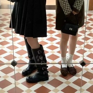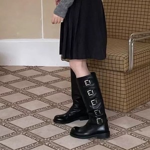 牛皮版~2025年新款小众设计圆头排扣长筒靴女百搭真皮粗跟直筒靴