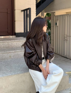 现货2025秋季新款韩版V*rgamot宽松复古纯色显瘦翻领拉链皮衣外套