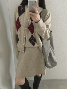 韩版菱格针织开衫半身裙三件套套装女秋冬宽松毛衣外套整套穿搭潮