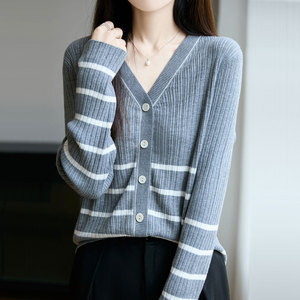 【厂家直供】撞色V领条纹开衫显瘦毛衣女秋季新款短款外搭针织衫