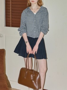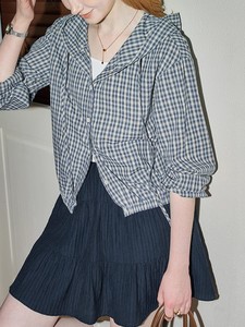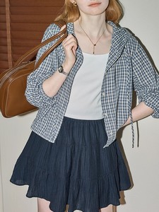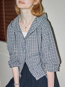库恩玛维美式蓝色格子长袖衬衫女2025年早秋新款韩版百搭连帽上衣