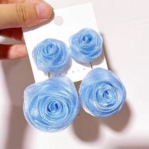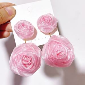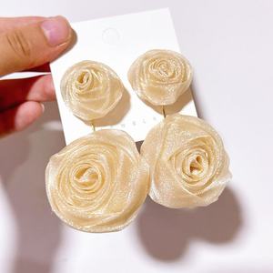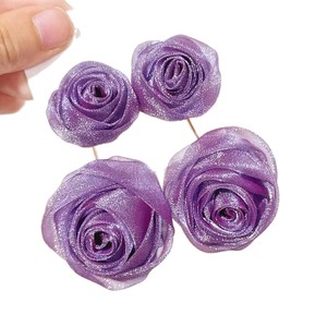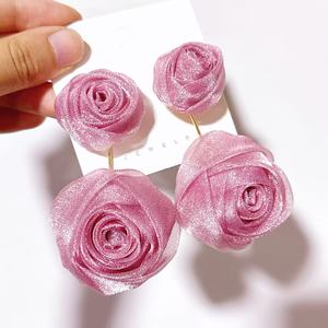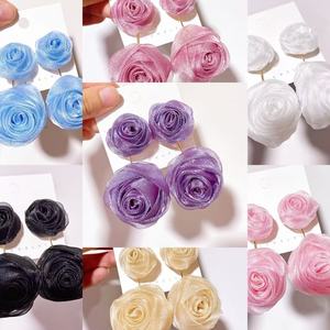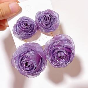 新款紫色网纱玫瑰花朵耳环 手工上下几何花卉耳坠雪纺花瓣耳饰