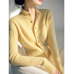 小香风半高领黄色毛衣外套女秋冬新款修身洋气软糯慵懒风针织开衫