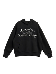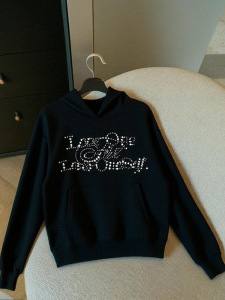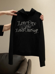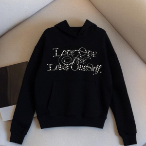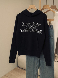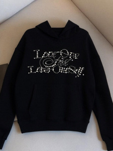 美式黑色连帽卫衣女春秋款2025新款复古珍珠烫钻女款正肩上衣秋季