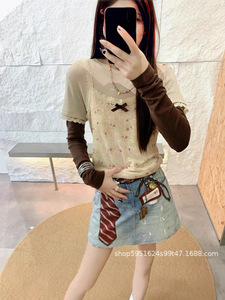 现货发!25早秋新款碎花吊带背心假两件长袖套头上衣女