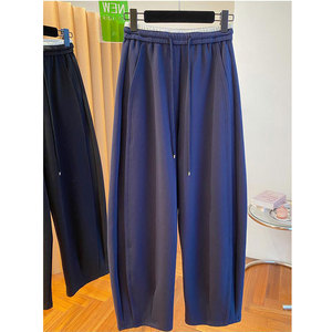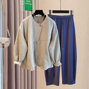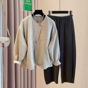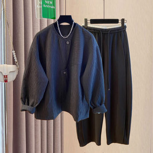 春秋新款肌理感不规则圆领开衫外套+松紧休闲裤两件套大版宽松女