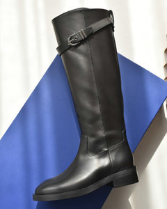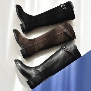 原单渠道货!欧美经典真皮长筒靴 圆头皮带扣中粗跟侧拉链骑士靴