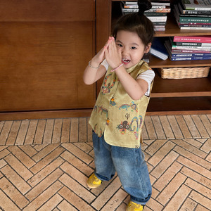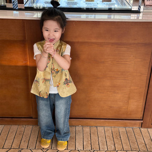 女童套装汉服新中式春秋装儿童网红穿搭坎肩提花马甲宝宝短裤唐装